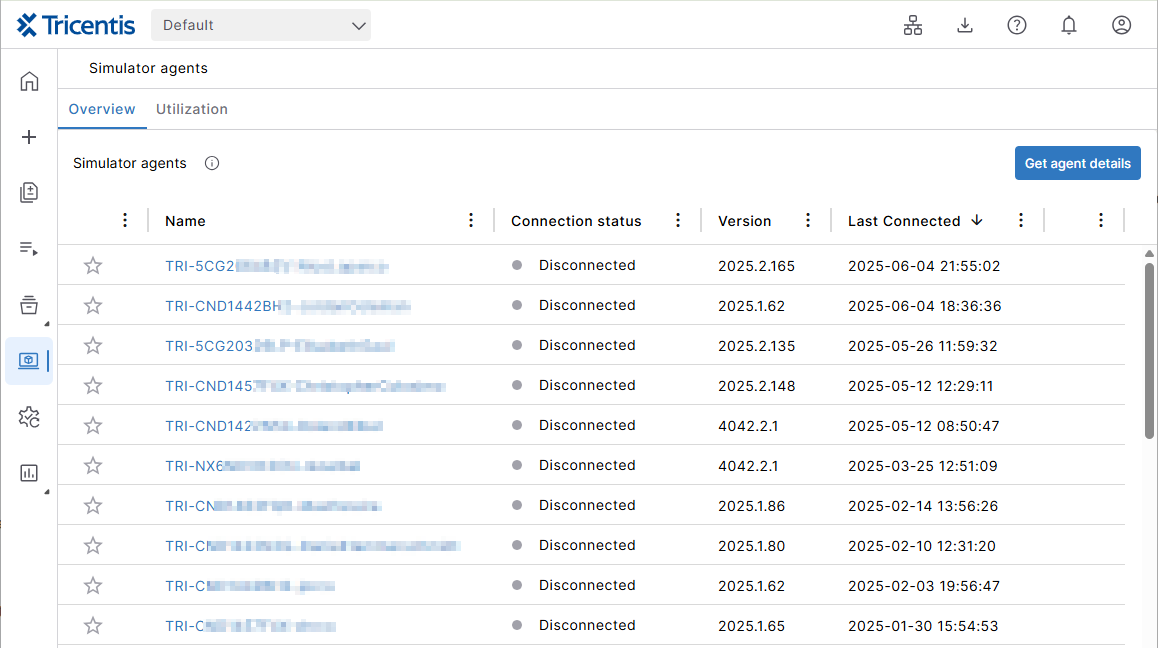 The シミュレータAgents details page shows you which simulation files are available on a particular シミュレータAgent.