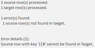 The result shows that the row by row comparison tried to find a matching Row Key for row 1|B|20 in the target, but didn't find one. It considers 1|B|20 processed.