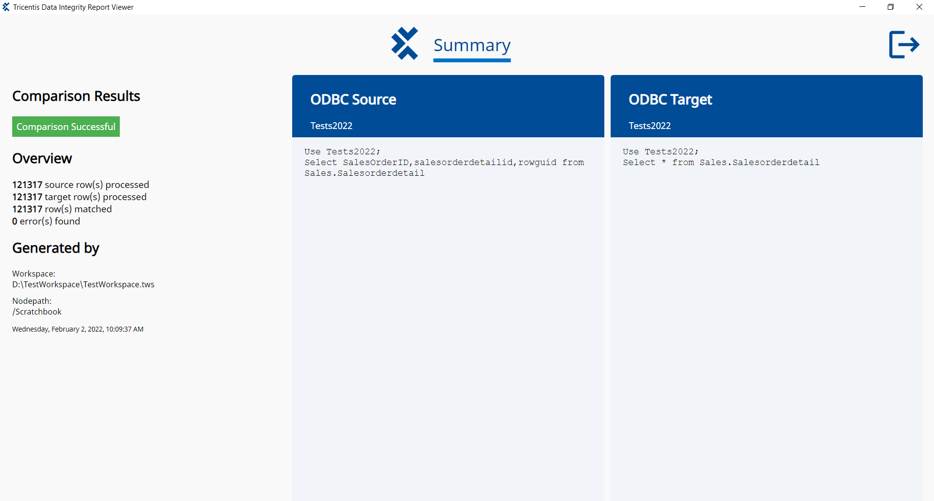 This opens the Summary page of your report.It displays the comparison results, an overview of the processed data and errors, and a description of the source and target.