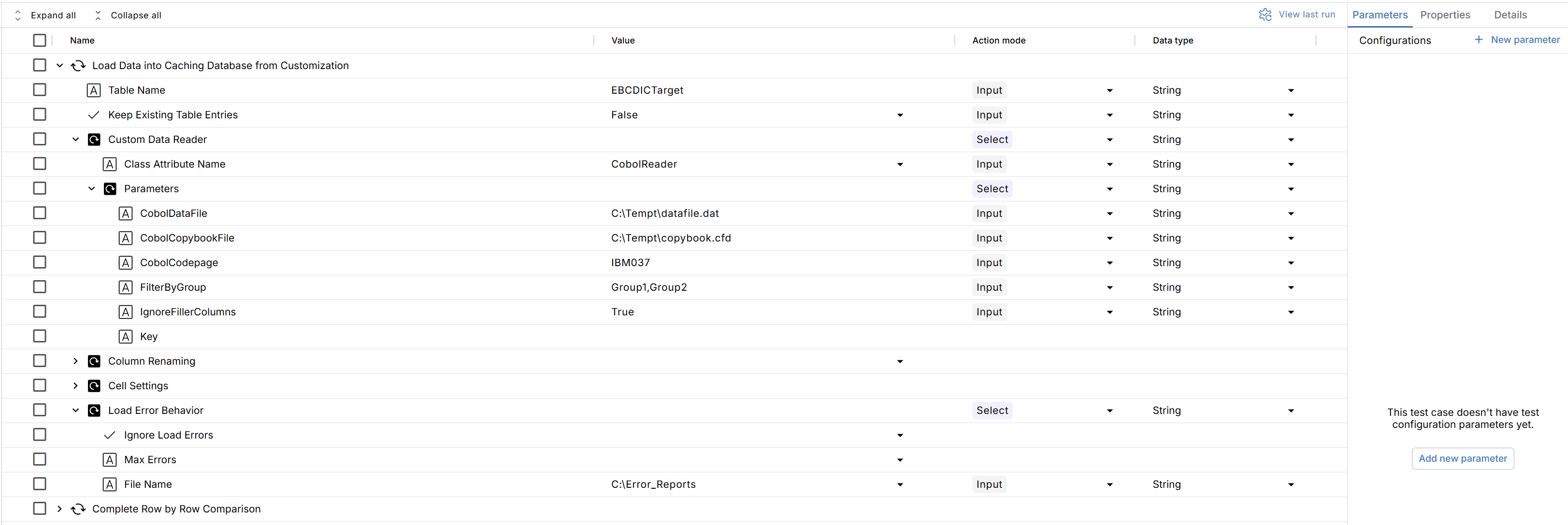 In this test case, you want to load data from a specific COBOL file into your caching database, so you can run a reconciliation test on it.