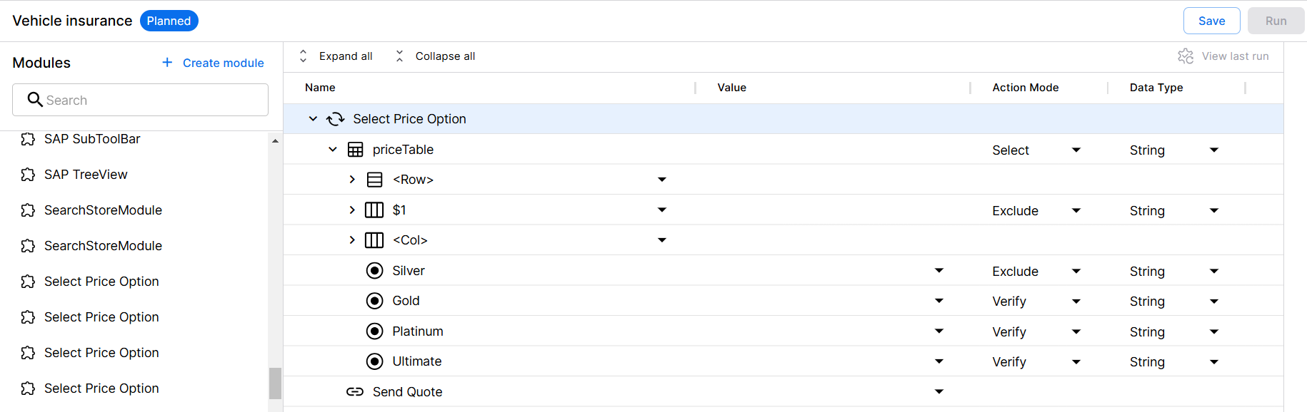 Action Modeの「Exclude」は、テーブルから特定の行または列を除きます。同じテストステップ内の行と列を除きます。