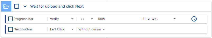 アクションタイプの「Verify」を使用して、テストケースに動的な待機時間を追加できます。こうすることで、Tosca Cloudコントロールが継続状態になる前の特定の状態に達するまで待機します。たとえば、プログレスバーが「次」のボタンが有効になる前に100%に達する必要がある場合です。