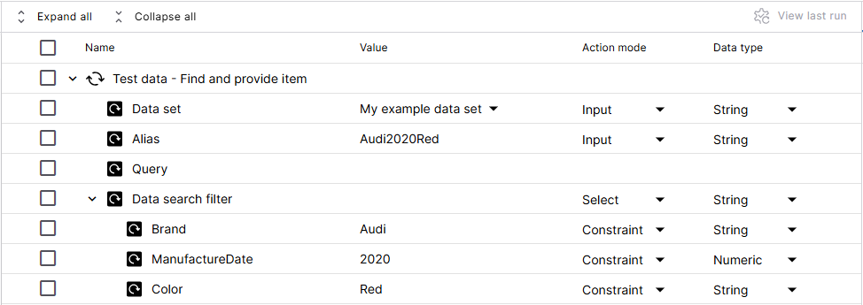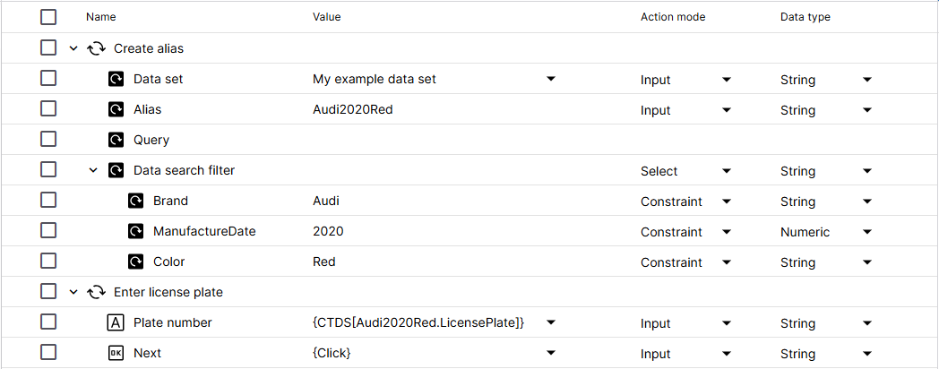 テストステップのCreate aliasでは、TestData - Find and provide itemモジュールを使用して、Audi2020Redというエイリアスを作成します。For this test step, we're reusing this "create alias" example.