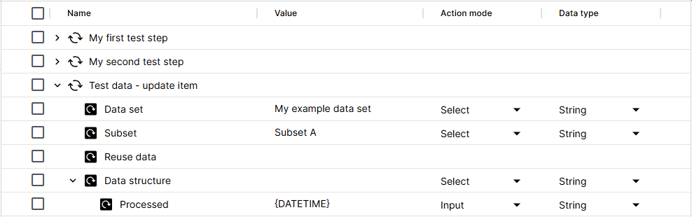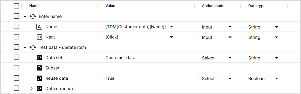 テストステップTest data - Update itemでは、テストラン中にTosca Cloudが消費する行を再利用することを定義します。