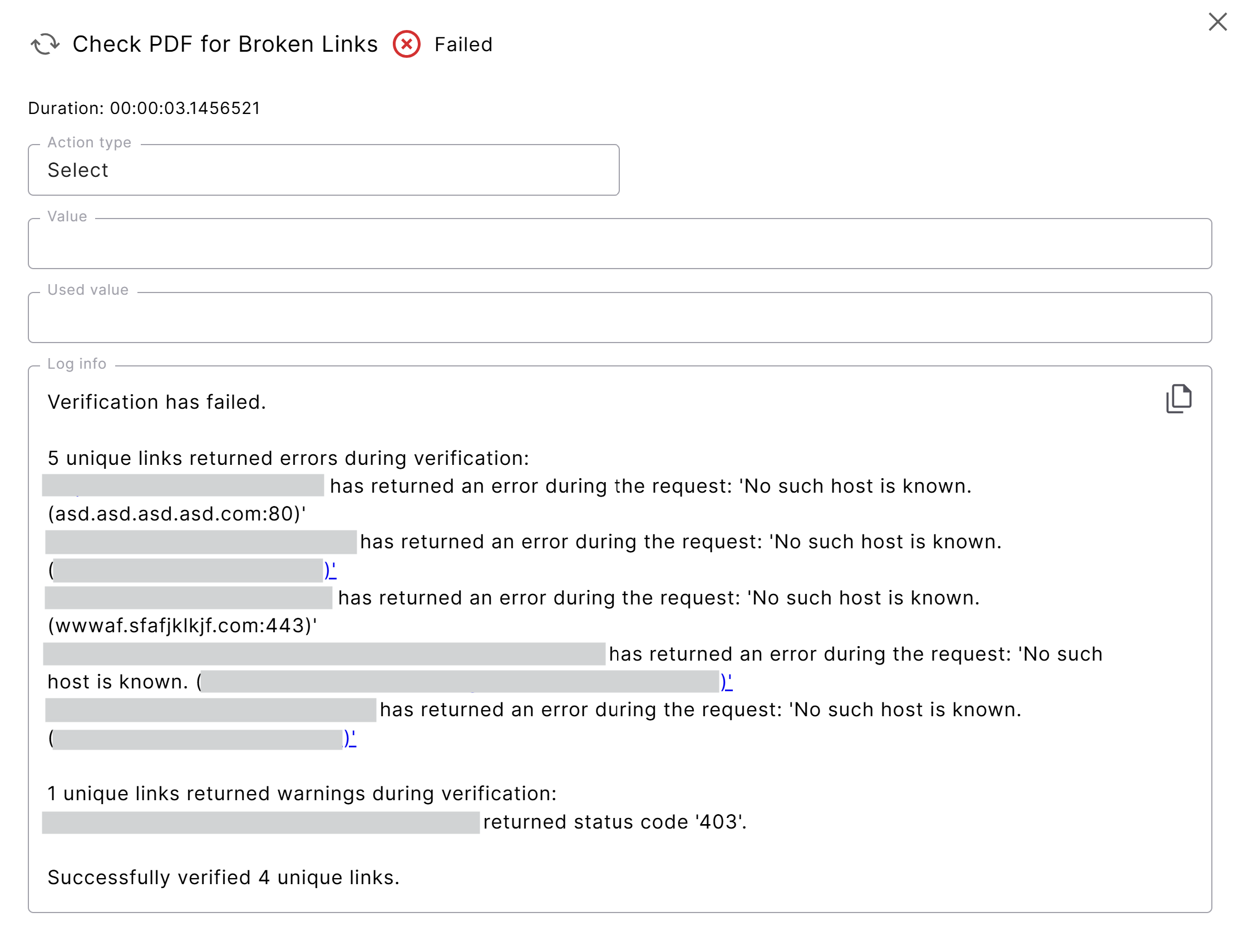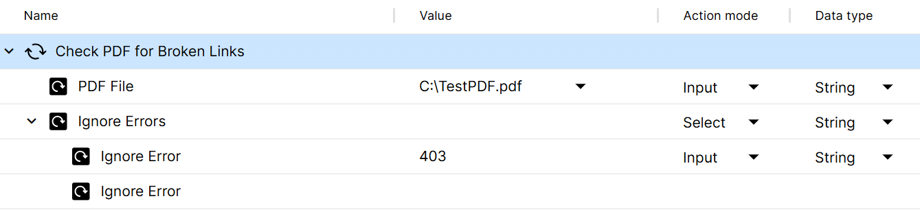 In this example, Tosca Cloud checks TestPDF.pdf for broken links.403 エラーを除くすべてのエラー種別をチェックします。