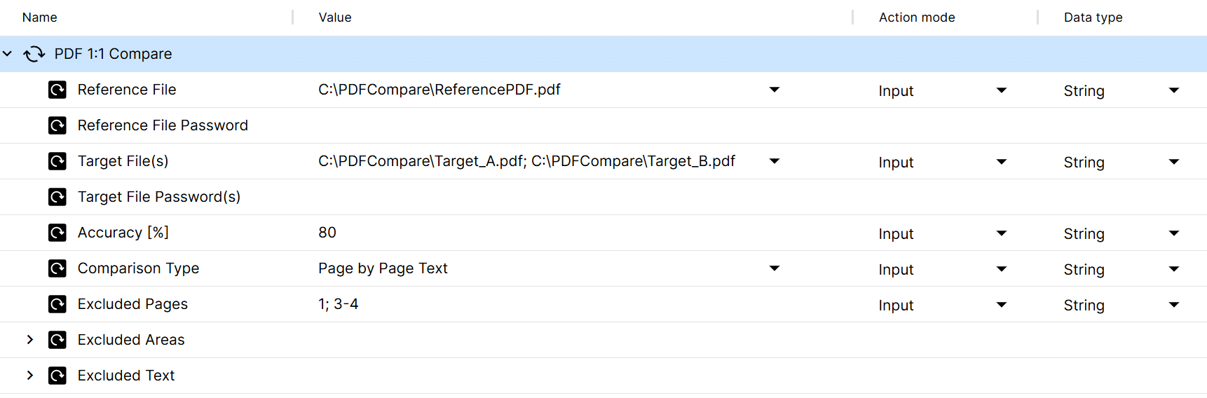 In this example, Tosca Cloud compares the text contents of the file ReferencePDF.pdf with the files Target_A.pdf and Target_B.pdf.