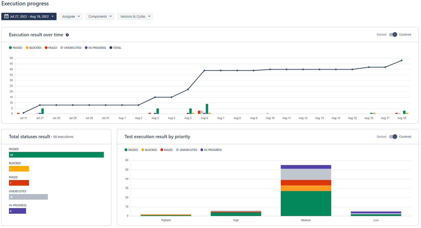 Test execution progress data is essential to determine how efficiently your testing activities progress over a period of time. It helps you monitor the success ratio of your testing tasks and provides important performance insights. This lets you identify quality bottlenecks, so you can communicate them to your development teams.