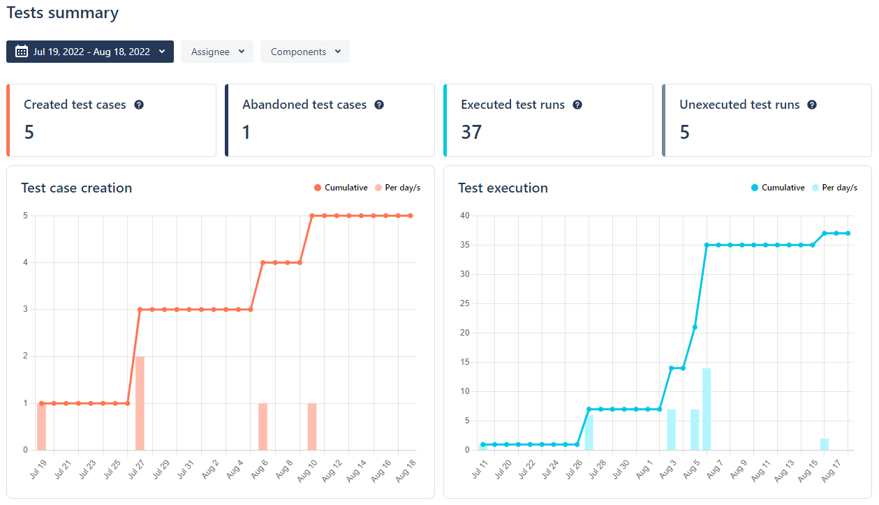 By default, Tricentis Test Management for Jira displays the data of all components and assignees fromof the last seven days. You can drill down to specific times and areas of interest: