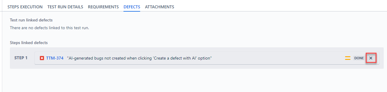 In the Defects tab, under Steps linked defects, hover over the relevant defect and select x.