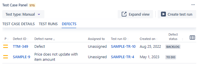 To view defects attached to a test case, go to the Test Design tab and open the test case you want to review. Then, select Defects from the Test Case Panel. Here, you can view all defects created from any test runs attached to the test case you selected. Please note that you can only create new defects in the Test Pad.