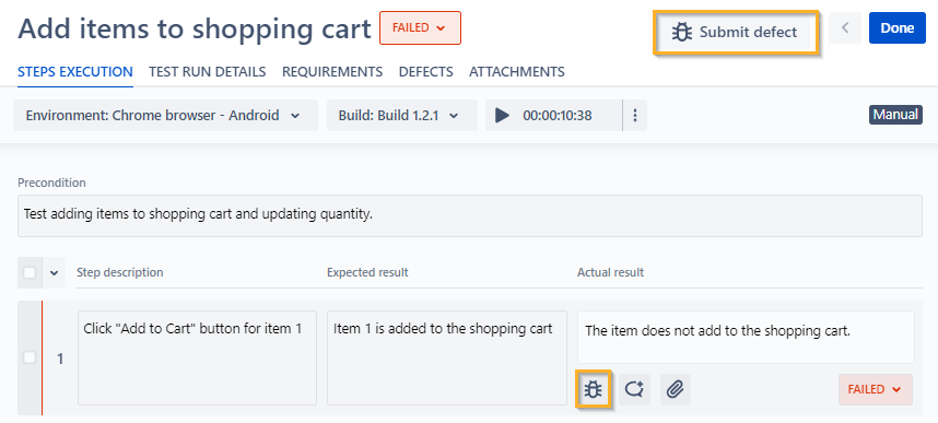 With defects, you can record any problems you encounter, at any stage of test run execution. This lets you create or reuse a Jira issue that describes the problem in detail. You can then assign this defect to the appropriate team and include it in your product development cycle.