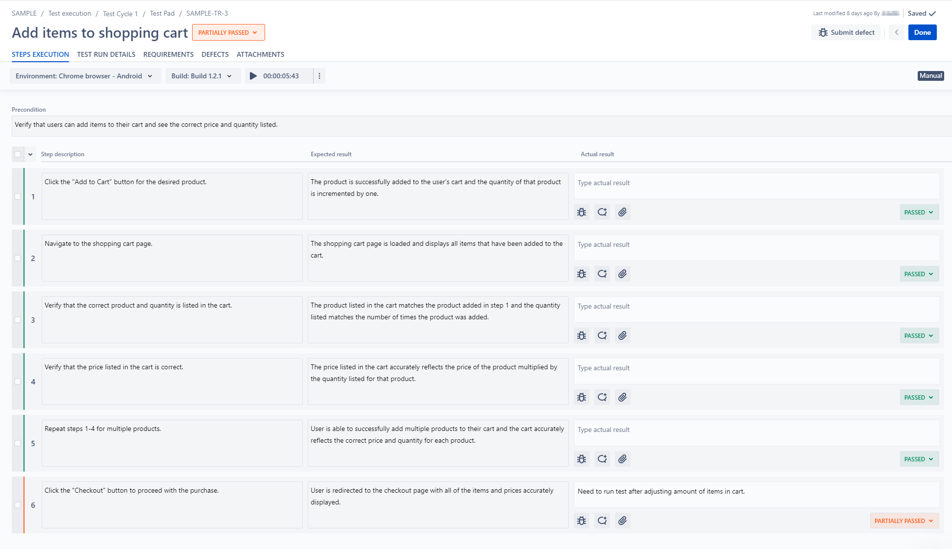 Snapshot of the test case in the first test run, which shows the original steps