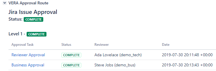 The Vera Electronic Signatures for Jira App displays the Vera Approval Route with approval task links and any rejection reasons in Jira.
