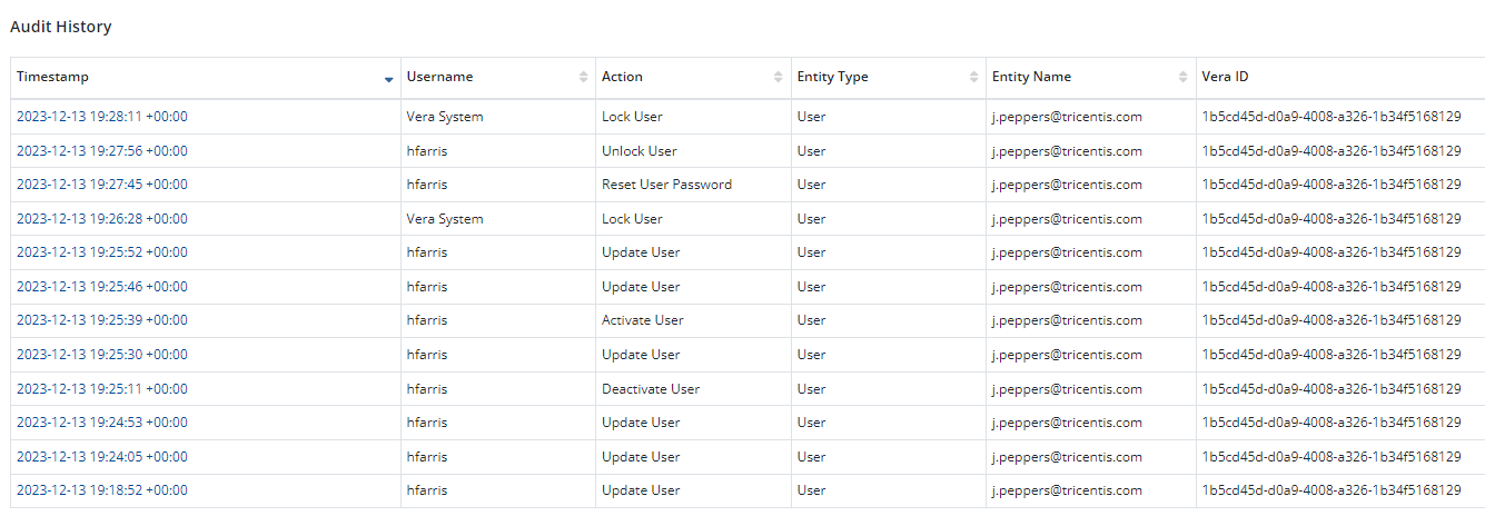Users assigned to the System Administrator roles are able to view audit history of Vera Site Administration. Audit history contains changes made to Vera including who made the change, when the change was made as well as the old and new field values if applicable.