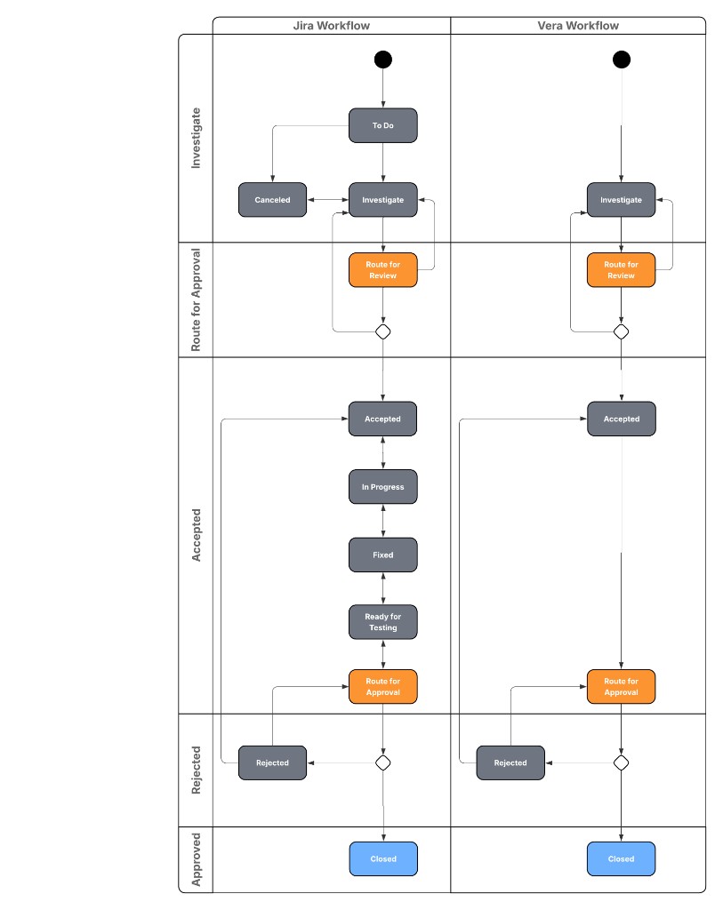 If your want to use Vera to handle approvals of your Jira tickets, you can create a Vera defect workflow that aligns with your Jira workflow. This way, approval transitions in Jira automatically trigger the correct Vera states. You don't need to create the entire Jira workflow.